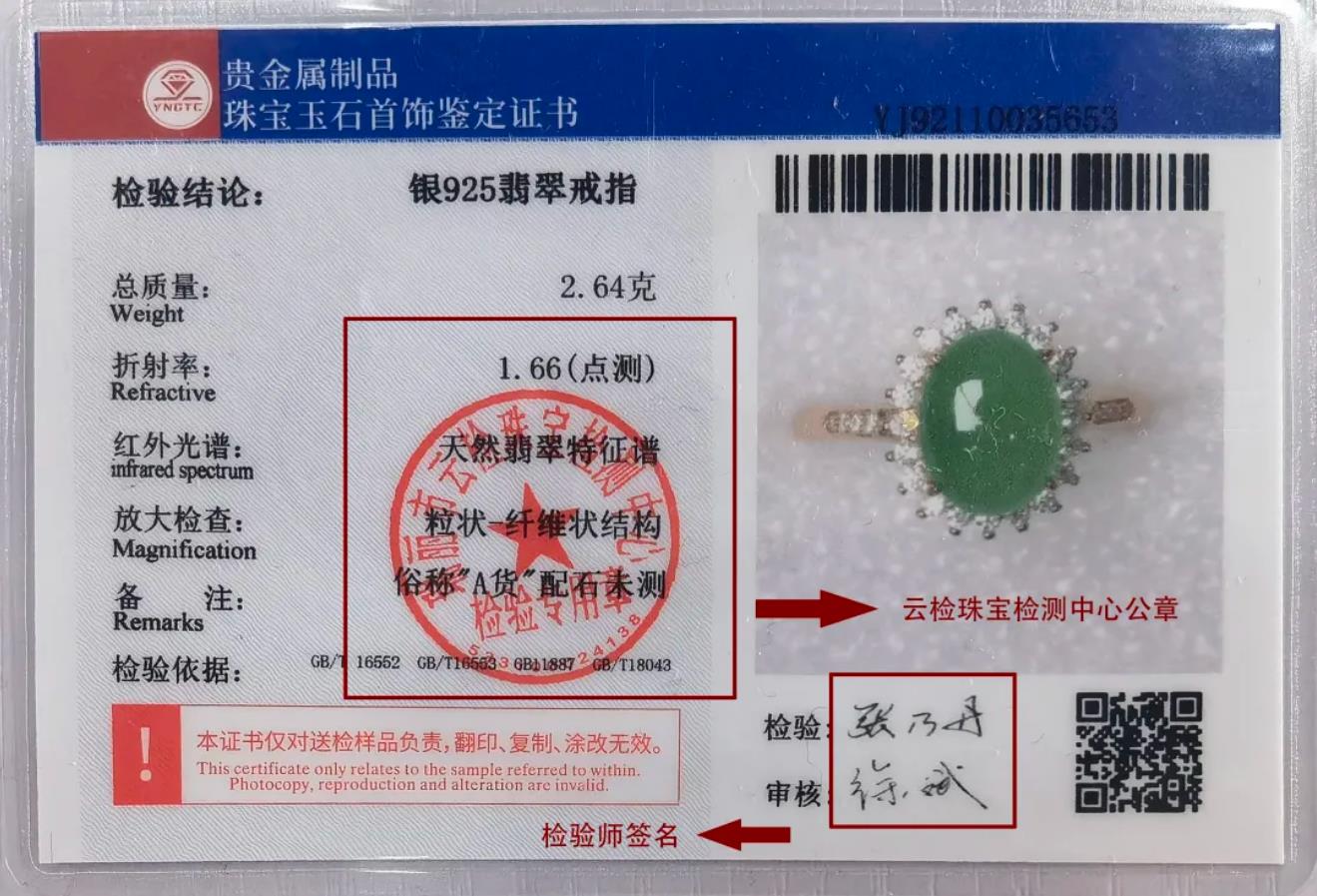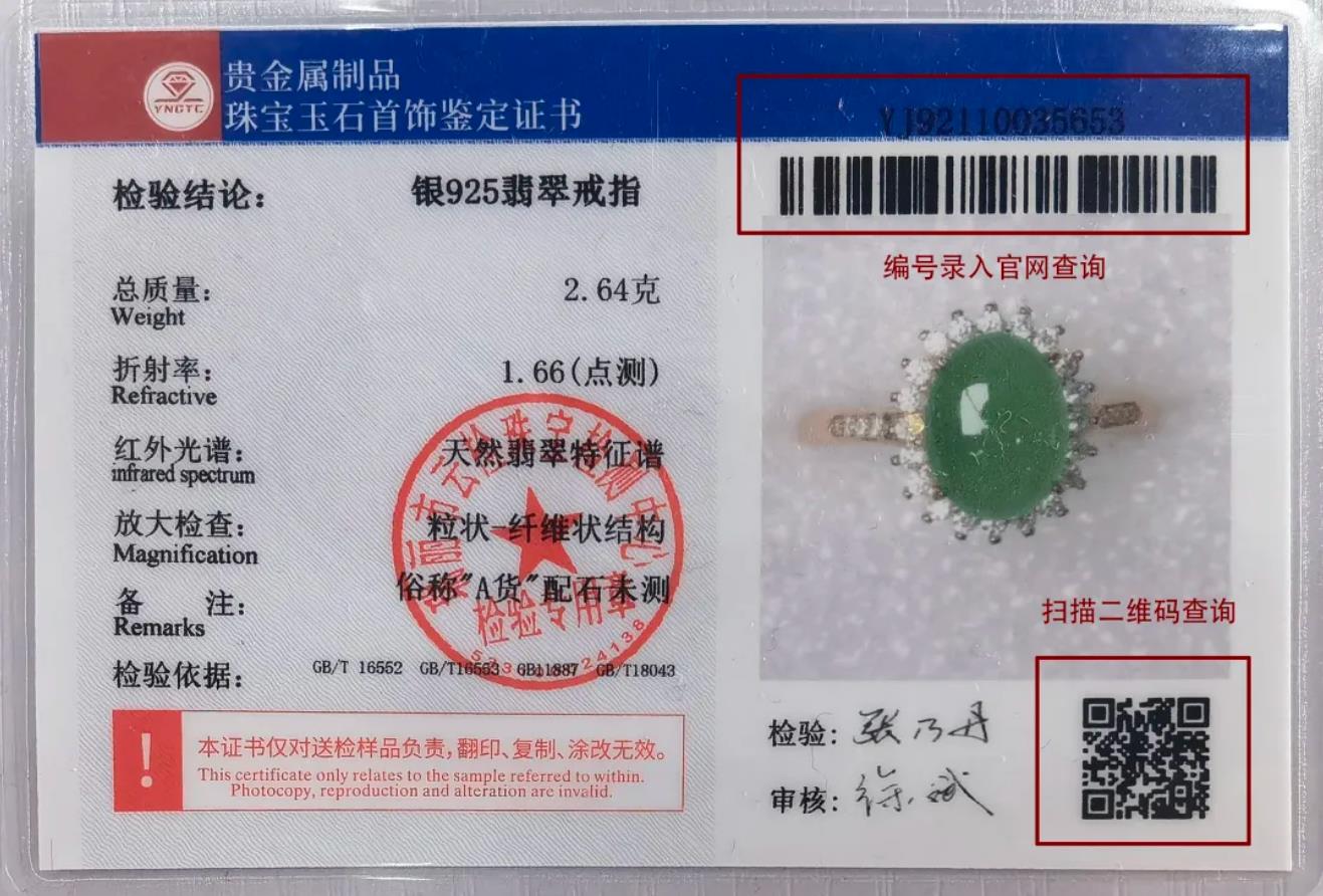 蜂鸟竞技珠宝玉石首饰鉴定证书背面有单位公章和检验师签名