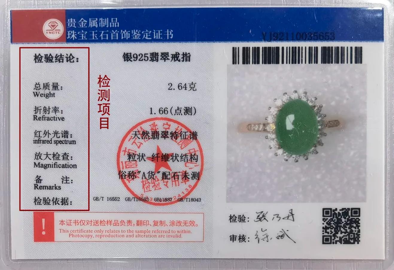 蜂鸟竞技珠宝玉石首饰鉴定证书背面有“检测项目”